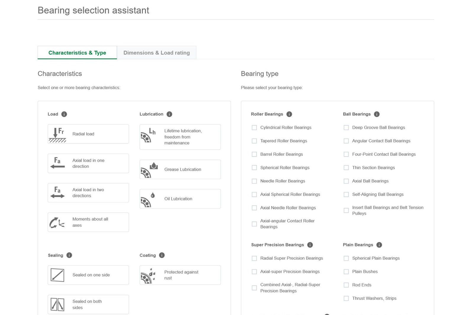 Με αυτόν τον πανίσχυρο αλλά και ευέλικτο στη χρήση ηλεκτρονικό βοηθό, μπορείτε να βρείτε γρήγορα και απλά τον τύπο έδρασης της Schaeffler που ταιριάζει στην εφαρμογή σας, επιλέγοντας διαστάσεις, τύπο ρουλεμάν, συνθήκες λειτουργίας (φορτία, θερμοκρασία)